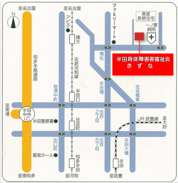 社会福祉法人 半田身体障害者福祉会 きずな 〒475-0074 愛知県半田市長根町3丁目1番2号 TEL:0569-29-5111 周辺地図 名鉄バスの場合 名鉄バス「一の草病院前」下車、西に向かって徒歩5分。 ※一ノ草病院西隣り(むそうさんの奥) 自動車の場合 半田常滑インター(半田中央)より東へ6.7km。 ※一ノ草病院西隣り(むそうさんの奥)