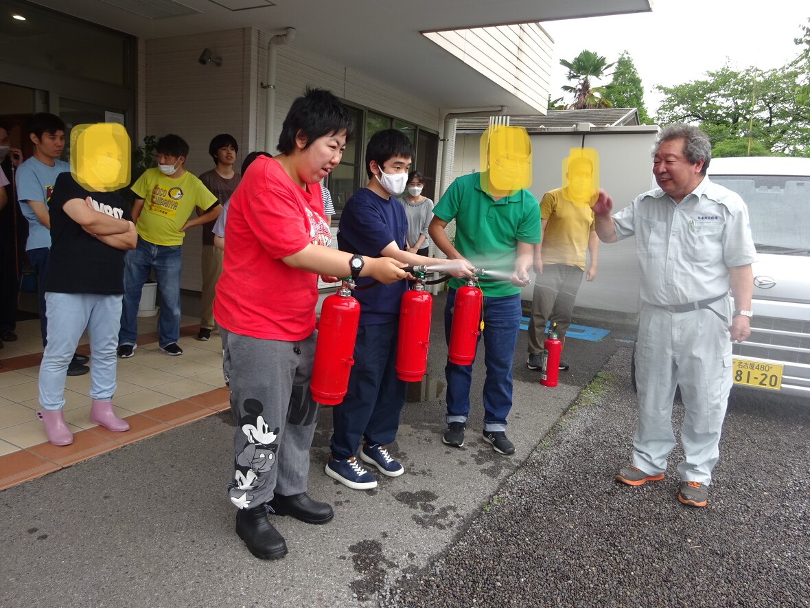 2024年06月28日(金) きずなニュース 防災訓練 防災訓練を行いました。 突然の非常ベルにひどく驚いていた利用者様もいましたが、職員の指示通りにしっかり避難できました。何度も訓練をしているので、みなさん動きはスムーズです。 避難した後は丸喜防災さんにお願いして、全員が水消火器で消火の訓練を行いました。利用者の皆さんも上手に消火器を扱っています。その後は全員で防災に関するDVD鑑賞をしました。