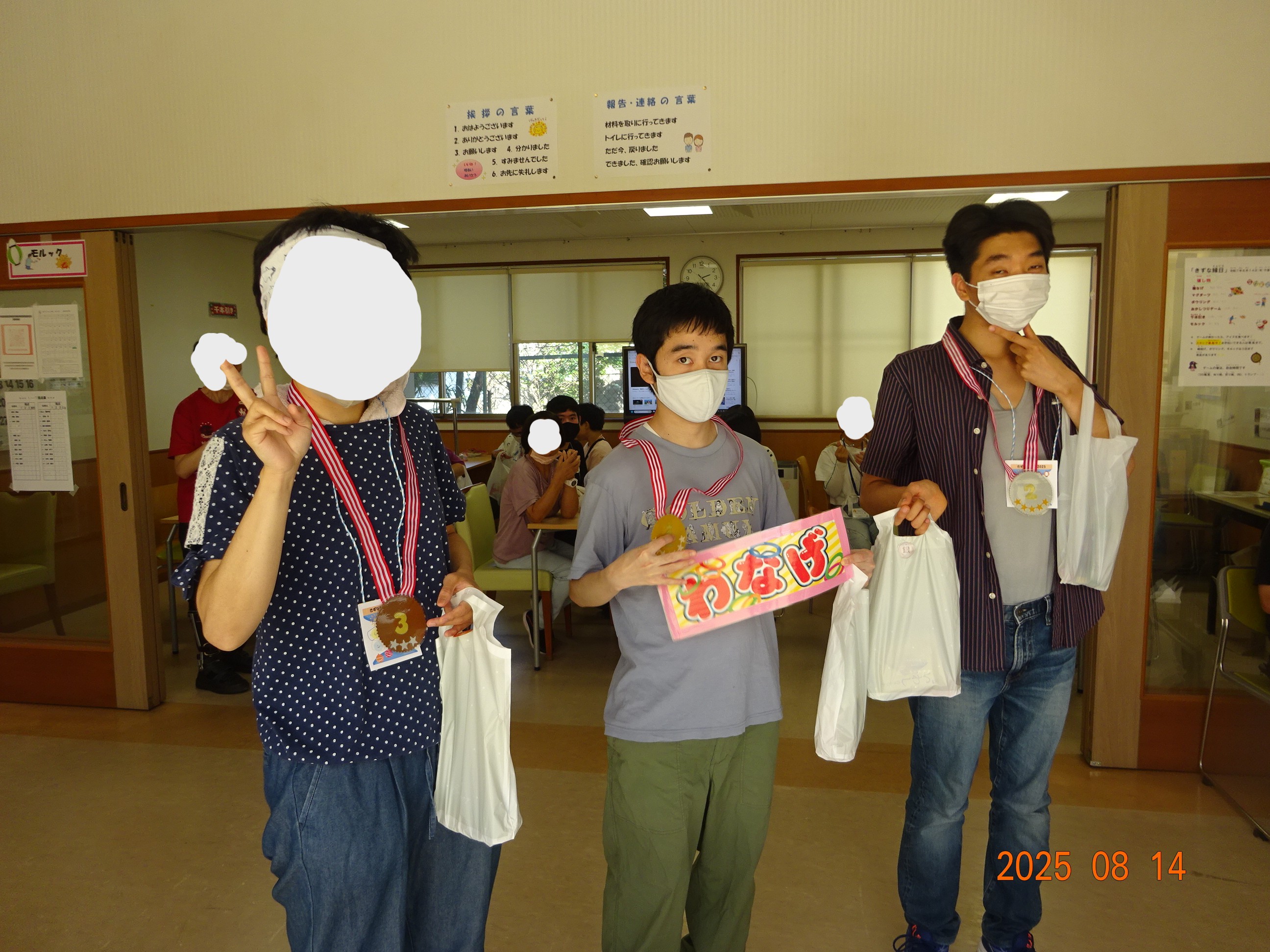 2025年08月14日(木) きずなニュース 縁日をしました 8月14日に縁日を行いました。例年通り「ボウリング」「ダーツ」「輪投げ」「お菓子釣り」「千本引き」に加え今年は新しく「モルック」もしました!初めてやるという利用者さんも多く「楽しかった!」「またしたい」という声も多かったです! 全部のお店を回りシールを集めた人からジュースとアイスを食べました♪
