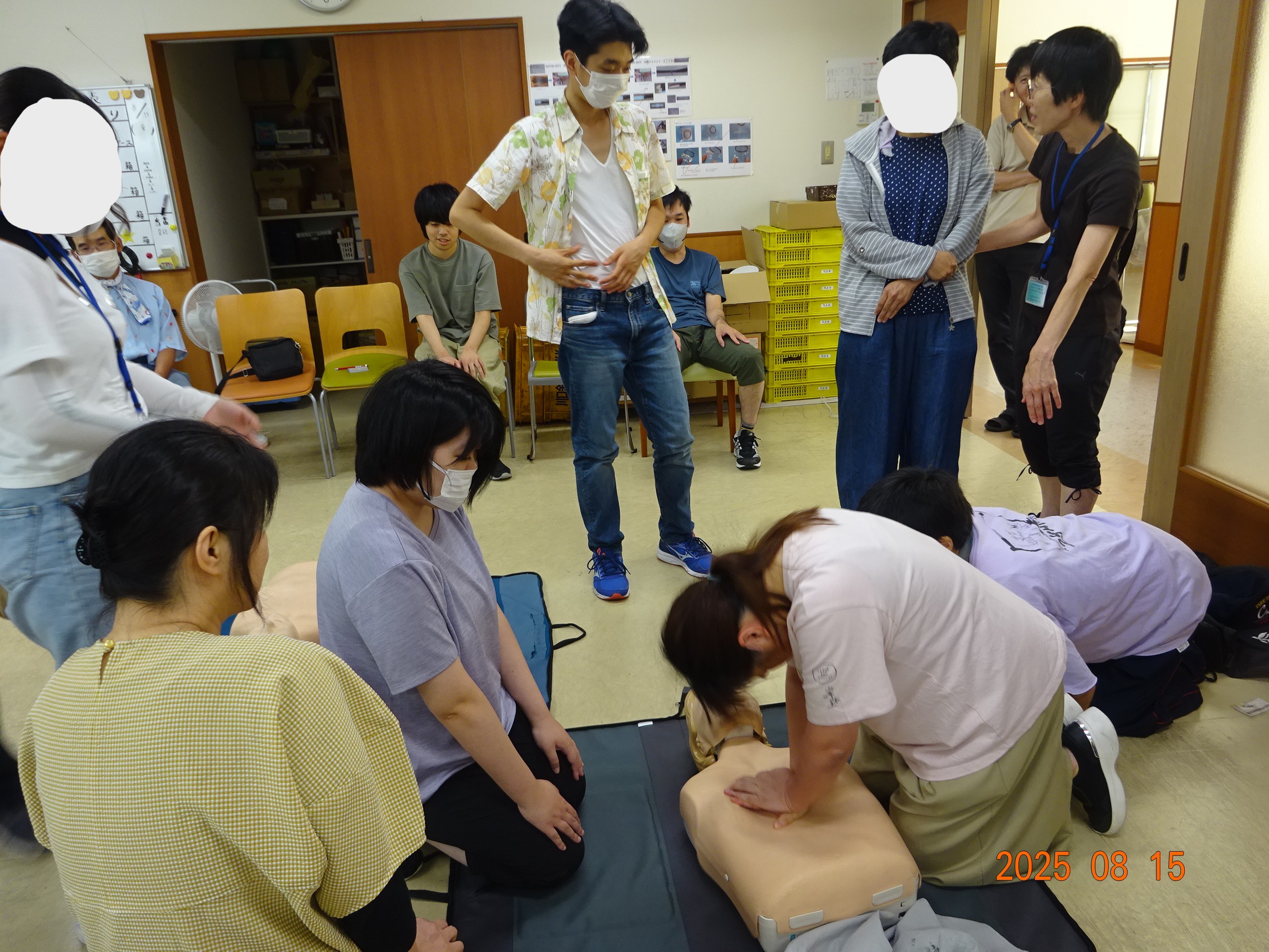 2025年08月15日(金) きずなニュース 学びの日 救命講習 今年も半田消防署の隊員さんをお招きして、救命講習会を開催しAEDの使い方を教えてもらいました。 利用者様も、職員もみんな真剣に話を聞き練習をすることができました。 今年は3回目ということで例年を思い出しながら取り組んでいる人も多かったです。