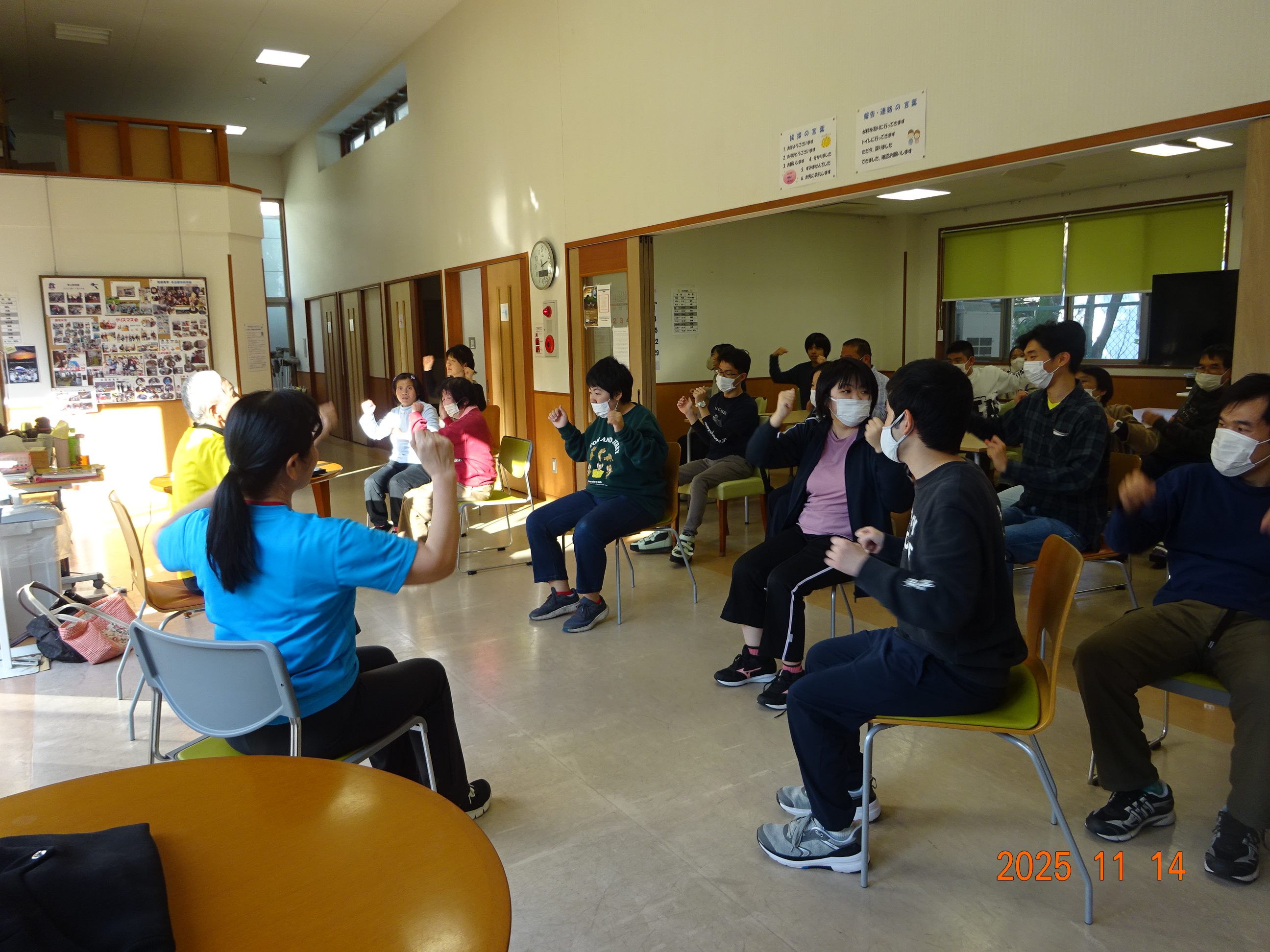2025年11月14日(金) きずなニュース 学びの日 健康体操 今年も学びの日に講師の方をお招きして健康体操を行いました。最初は簡単に手足を動かしその動きを「三百六十五歩のマーチ」に合わせて体を動かしました!その後みんなお馴染みの「パプリカ」で楽しく体を動かしみなさん楽しそうでした♪