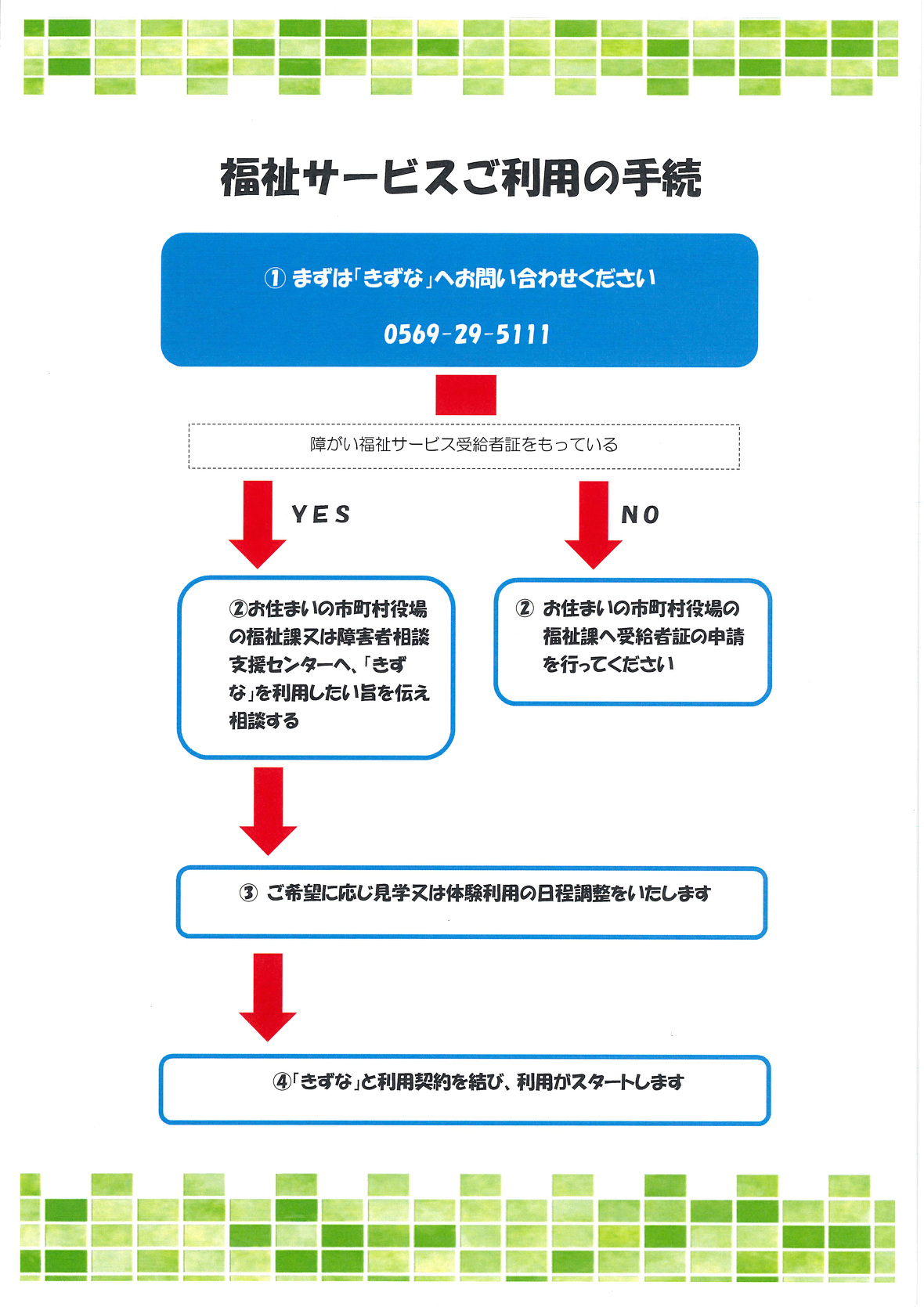 ◇ご利用の流れ ※見学・体験は随時受け付けております。 興味のある方はお問い合わせください。 ※電話 0569-29-5111 受け入れ可能人数にまだ若干余裕があります。 (2024年10月現在) ◆◆利用者定員◆◆ 就労継続支援B型 /20名