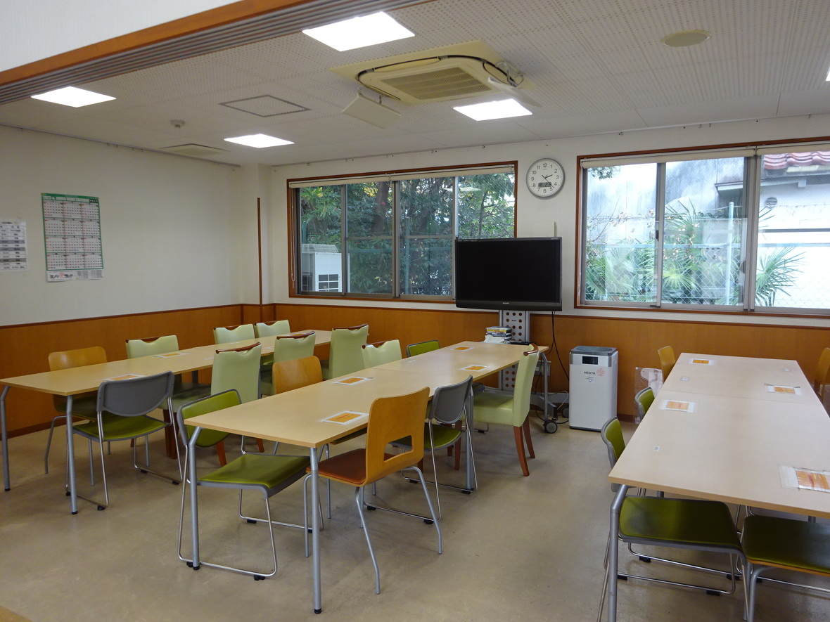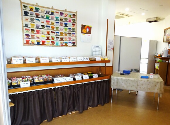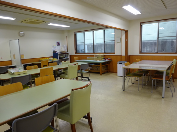 施設紹介 施設外観 駐車場から入って前へ進んで行くと・・ 建物玄関。入り口は自動ドアです。 菓子販売入り口 毎月第2水曜はシフォンケーキと焼菓子の販売日です。 更衣室 利用者様もひとつずつロッカーを使っていただけます。 作業室 広い作業台に少人数ずつ着いて仕事を進めます。 壁向きで作業することで、集中力がアップしています。 菓子厨房 ここから美味しいお菓子がたくさん誕生します。 いつでも清潔、ピカピカな厨房です。 障害者用トイレ 施設はバリアフリー。車椅子の方もご不便がありません。 食堂 中庭に面した明るいスペースです。 食堂の奥は月に1度お菓子屋さんに変身します。 多目的室 作業にも休憩にも使われています。 中庭 廊下からは中庭に面する空間が多く、開放感が感じられます。 お昼休みにはベンチでまったり過ごしたり、軽く体を動かしたり。 廊下 広々とした廊下は朝礼・終礼をする場所にも。 玄関から突き当りまで段差が全くありません。
